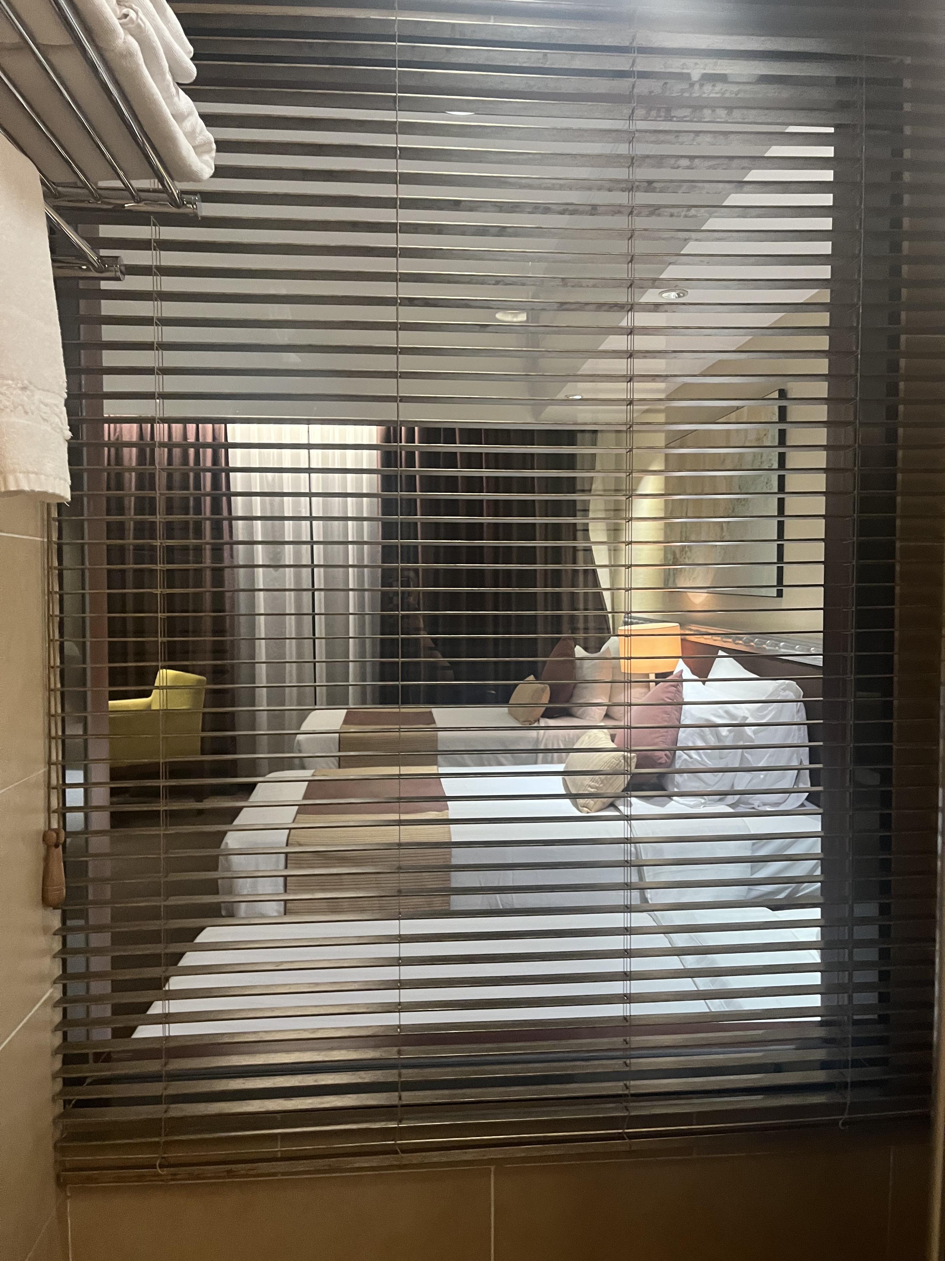 샤워 부스에 통창이 달려 있어서 블라인드를 쳐줘야 밖에서 안 보인다.